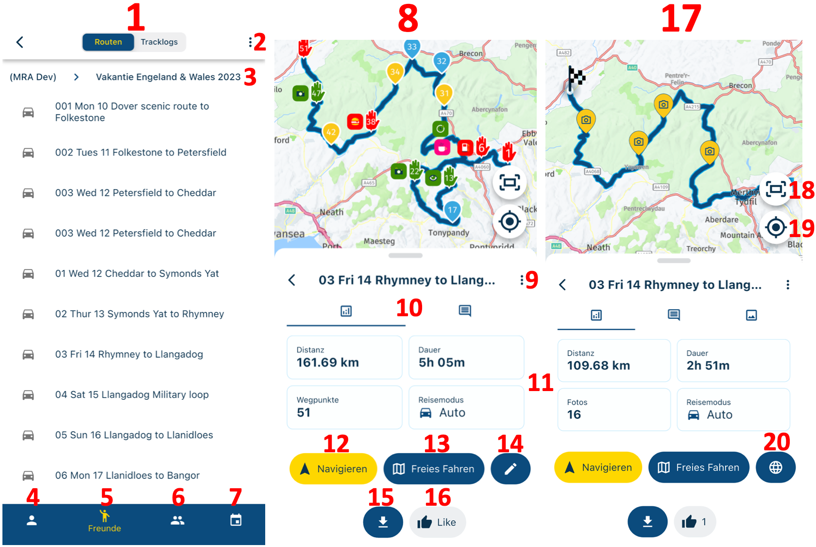 20. Website: Diese Schaltfläche wird angezeigt, wenn die Route in der App nicht bearbeitet werden kann. Dadurch wird die Route/Tracklog auf der Webseite geöffnet.